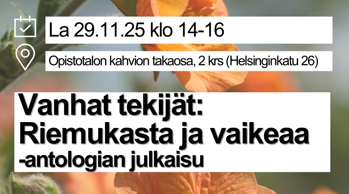Tervetuloa juhlistamaan MA Sari Pauloman luotsaaman Antologian kautta omaan teokseen -kurssin huipentumaa! Kurssin kirjoitussato on nyt korjattu ja kerätty yksiin kansiin. Vanhat tekijät: Riemukasta ja vaikeaa -teoksen julkistamistilaisuus järjestetään työväenopiston Valoa ja iloa -joulutapahtuman yhteydessä Opistotalon Oppiskahvion takaosassa luokkatilassa Vanni. Tervetuloa kaikki mukaan lauantaina 29.11.2025 klo 14-16!